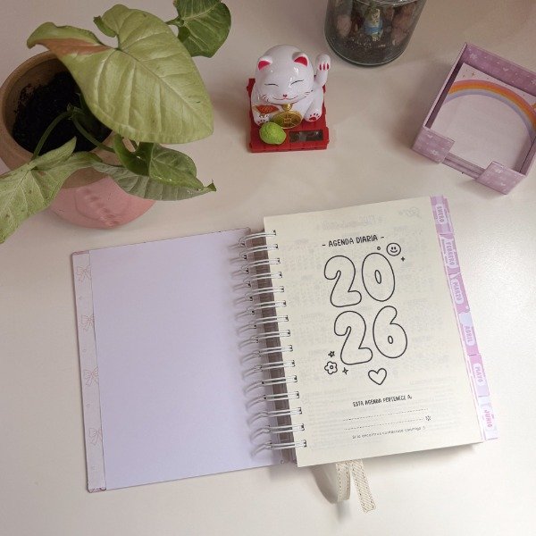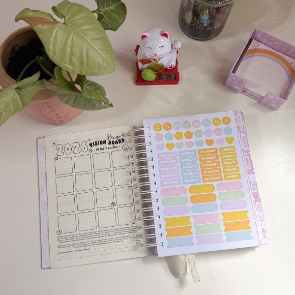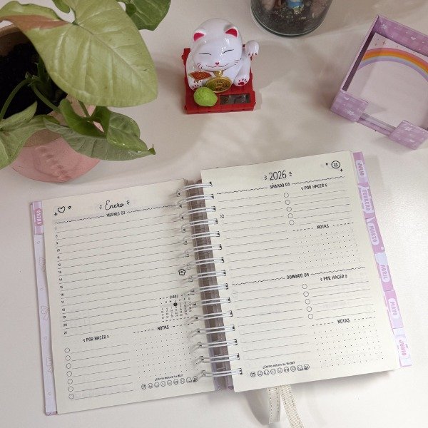Por cada mes trae planificador y balance mensual (para anotar ingresos y gastos), registro de hábitos y un día por hoja excepto sábado y domingo que la comparten 😊