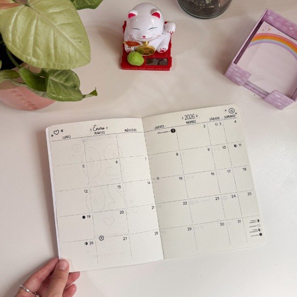 El clásico de todos los años, tiene el calendario de cada mes en dos páginas continuas 😊